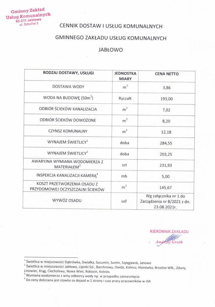 25 sierpnia 2021 Aktualności Komentarze wyłączone webdeveloper Cennik dostaw i usług komunalnych Gminnego Zakładu Usług Komunalnych Jabłowo Powiązane posty Woda może być ponownie używana bez 6 grudnia 2025 Komunikat nr 1- brak przydatności do 4 grudnia 2025 Informacja – 10.11.2025 Zakład NIECZYNNY 4 listopada 2025
