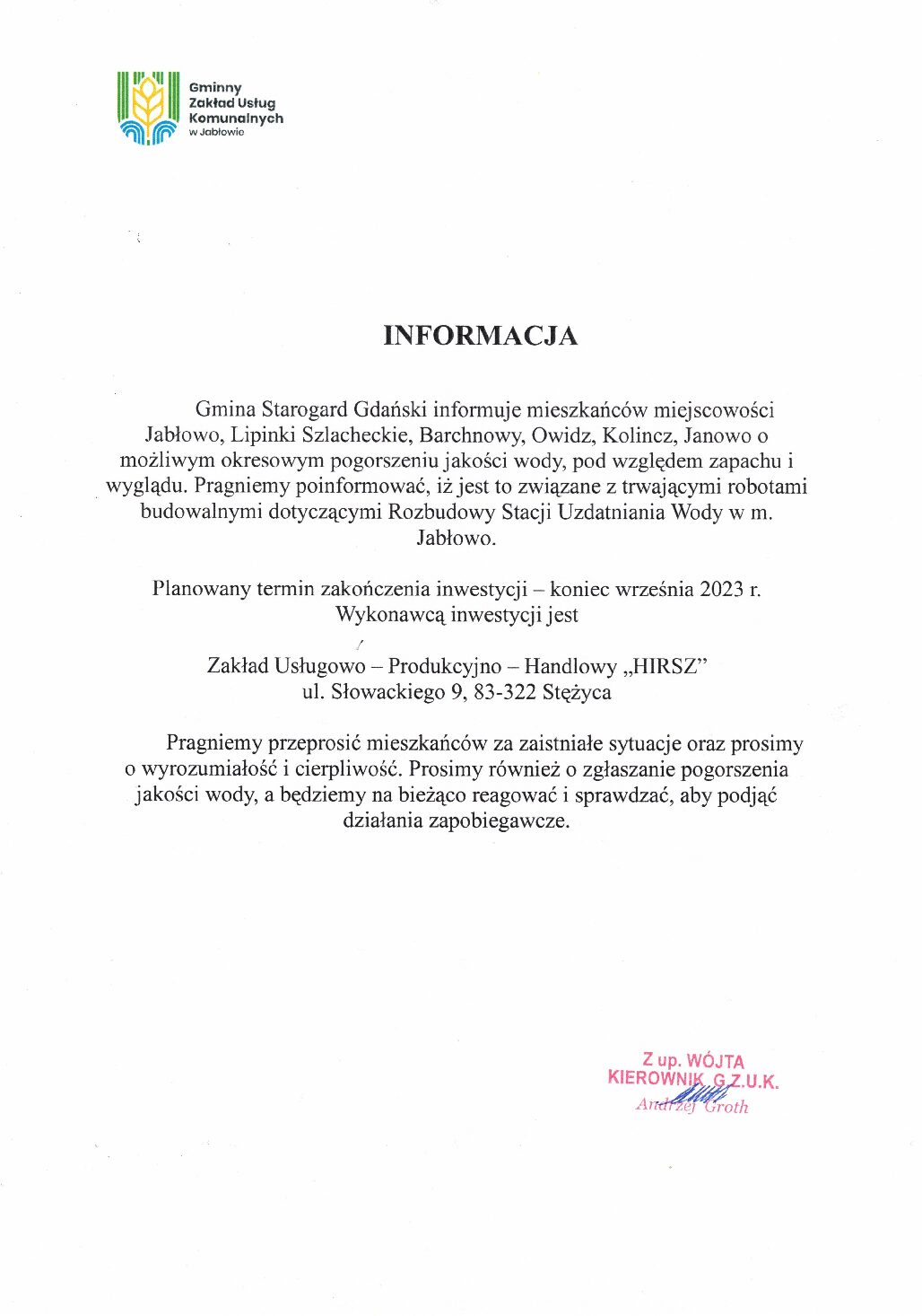 6 sierpnia 2023 Aktualności Komentarze wyłączone webdeveloper Informacja dla mieszkańców Powiązane posty Woda może być ponownie używana bez 6 grudnia 2025 Komunikat nr 1- brak przydatności do 4 grudnia 2025 Informacja – 10.11.2025 Zakład NIECZYNNY 4 listopada 2025
